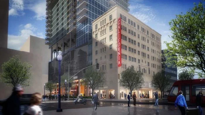 As quickly as progress started, it came to a grinding halt. The long awaited C Street revitalization and redevelopment looked to be on the horizon. On its 90th birthday in April of 2017, the California Theatre (located at Fourth Avenue and C Street) received a grim yet exciting birthday present when the City Council approved its demolition in favor of a 40-story residential tower. This redevelopment called “The Overture”, would rise 422 feet, include 282 apartments or condos, and encompass 11,000 square feet of retail space. In addition, there would be space for displaying art and the original marquee sign would be restored and reinstalled.